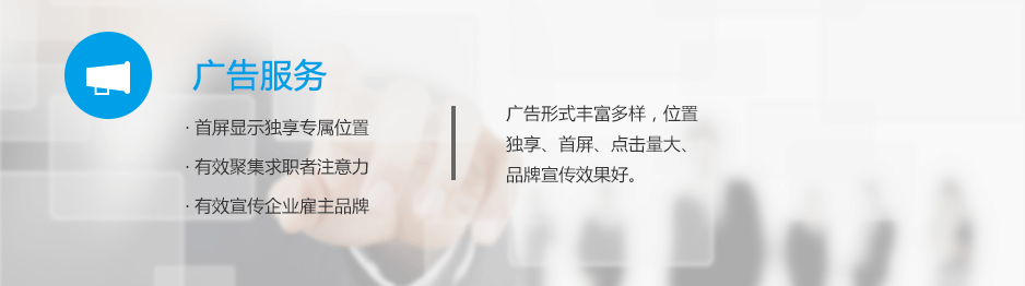 廣告服務(wù)基于龐大的網(wǎng)絡(luò)平臺(tái),位于首屏,企業(yè)客戶可以在首頁(yè)擁有專享位置,被推薦的職位和公司始終占據(jù)求職者的第一視線,極大地聚焦求職者的注意力,從而大幅度提升招聘職位的關(guān)注度、點(diǎn)擊量及招聘效果。廣告有知名企業(yè)招聘、熱點(diǎn)招聘、品牌招聘、搜索置頂、海報(bào)等多種類型。企業(yè)客戶可根據(jù)招聘需求選擇合適的廣告類型,完成招聘需求。